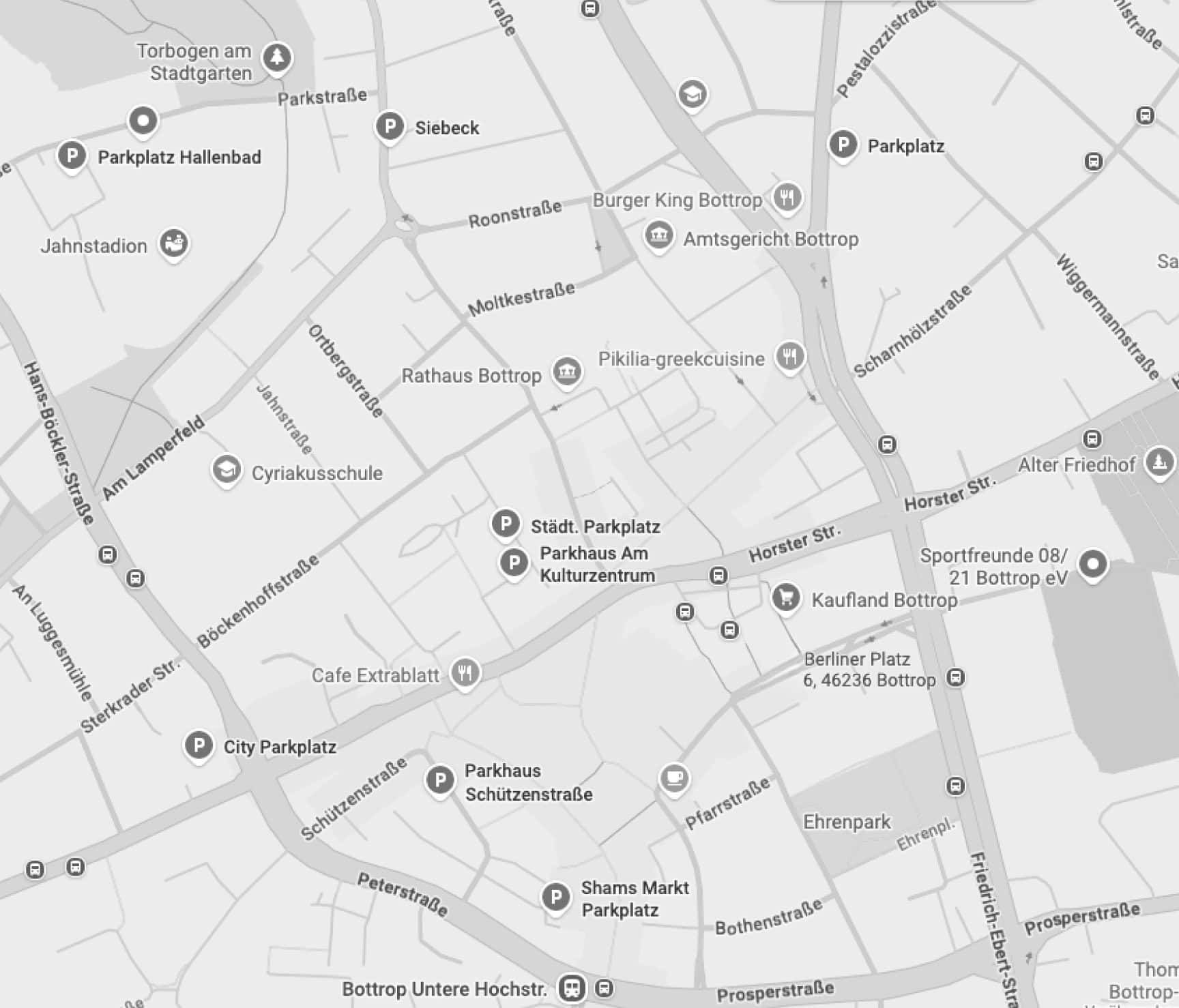 Über die umliegenden Hauptverkehrsachsen (A2, A42) gelangt man direkt in die Innenstadt von Bottrop. Der Standort “Berliner Platz” ist gut ausgeschildert und zentral gelegen. Parkmöglichkeiten befinden sich in unmittelbarer Nähe und ermöglichen einen kurzen, komfortablen Weg ins Gebäude.